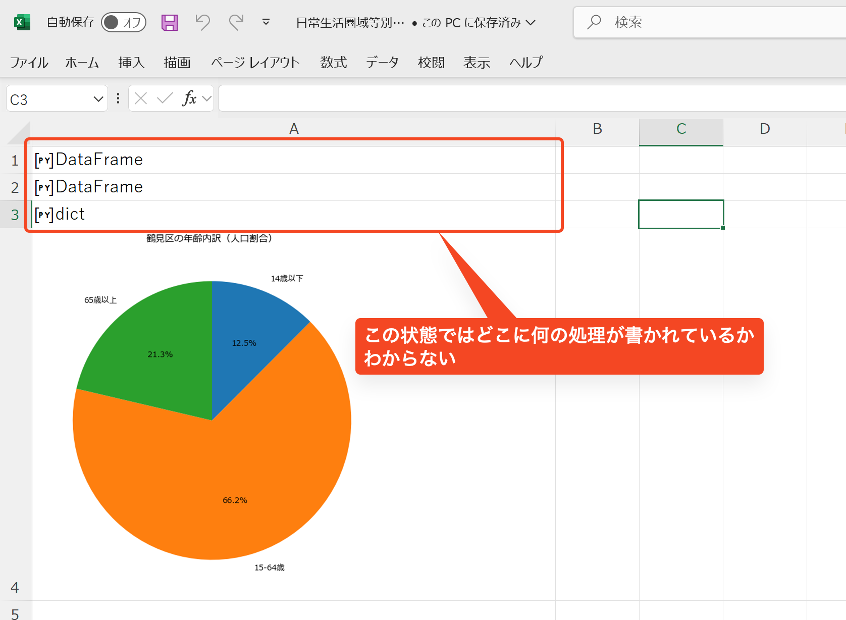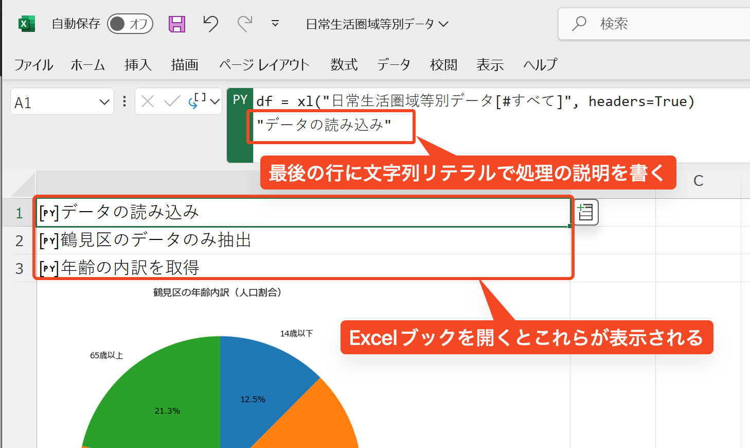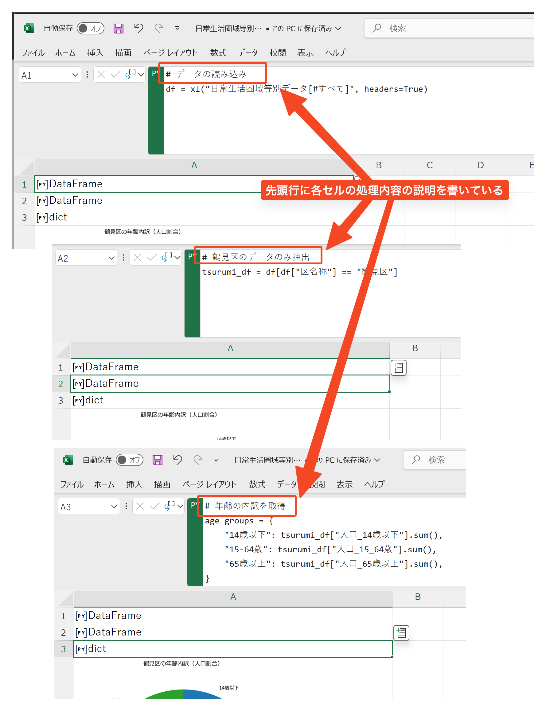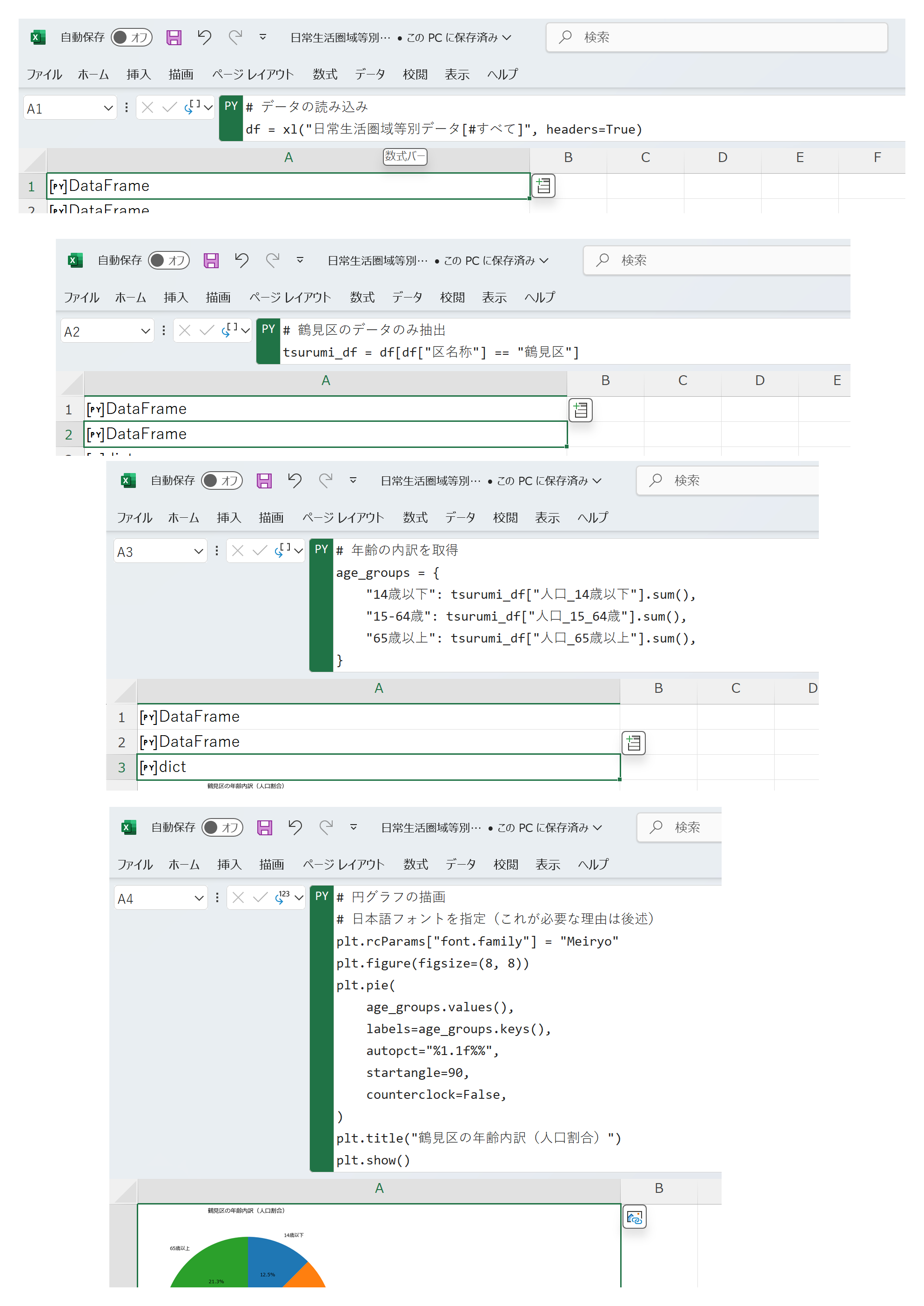 例として、横浜市のオープンデータから日常生活圏域等別データ(2018年3月~2024年3月)を使って、鶴見区の人口の年齢内訳を表す円グラフを作ってみます。 なお、Excelシート上のテーブルには「日常生活圏域等別データ」という名前を付けていることを前提としています。 以下のコードを見てください。すべての処理を1つのセルにまとめて書いています。