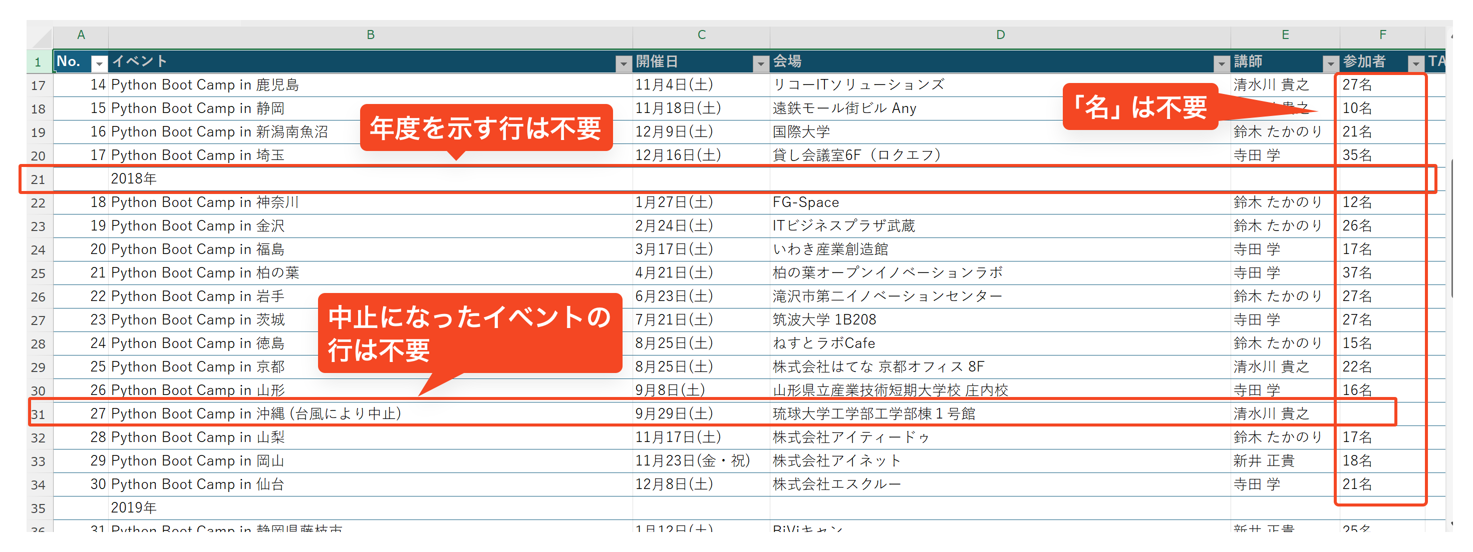 Python in Excelを使う場合は、元のデータをそのまま取り込み、Pythonで加工することをおすすめします。 上記の例の場合は、以下のようなPythonコードを書くことで、不要なデータを削除できます。 なお、以下のコードはExcelシート上のテーブルに「PyCamp開催実績」という名前を付けていることを前提としています。