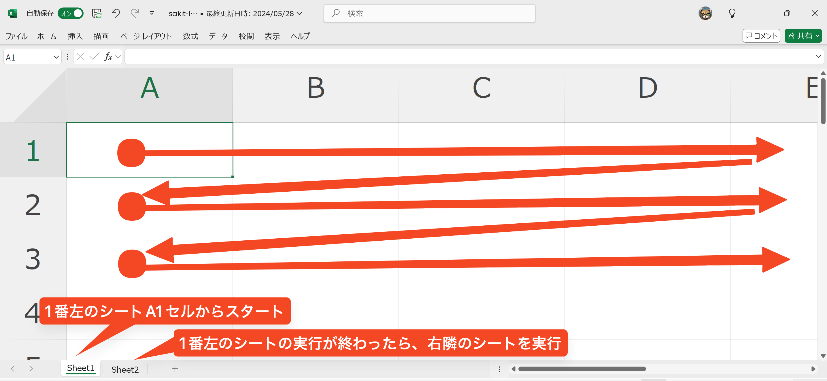 コードを複数のセルに分割して書く際に覚えておいてほしいのは、セルの実行順序です。 Python in Excelで定義された変数や関数は、Excelブック全体でグローバルなスコープです。 そのため、どの順番でコードが実行されるかを把握しておかないと、未定義の変数や関数を呼び出してしまい、NameErrorが発生することがあります。