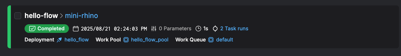 │ Deployment 'hello-flow/hello_flow' successfully created with id '5e07e9a9-6b1f-438d-b37d-6933194bf43f'.                                                       │