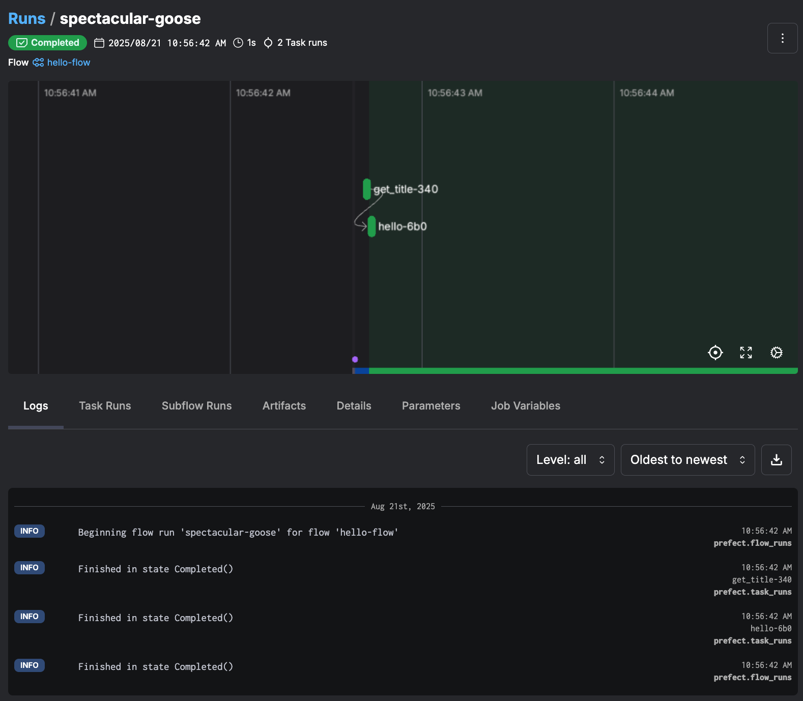ここで1つ注意点があります。 Prefectのフロー名は内部的にスラッグ化 (slugify) されます。 このため、アンダースコアが自動的にハイフンに変換され、出力結果からもわかるようにフロー名 hello_flowhello-flow に変更されていることがわかります。