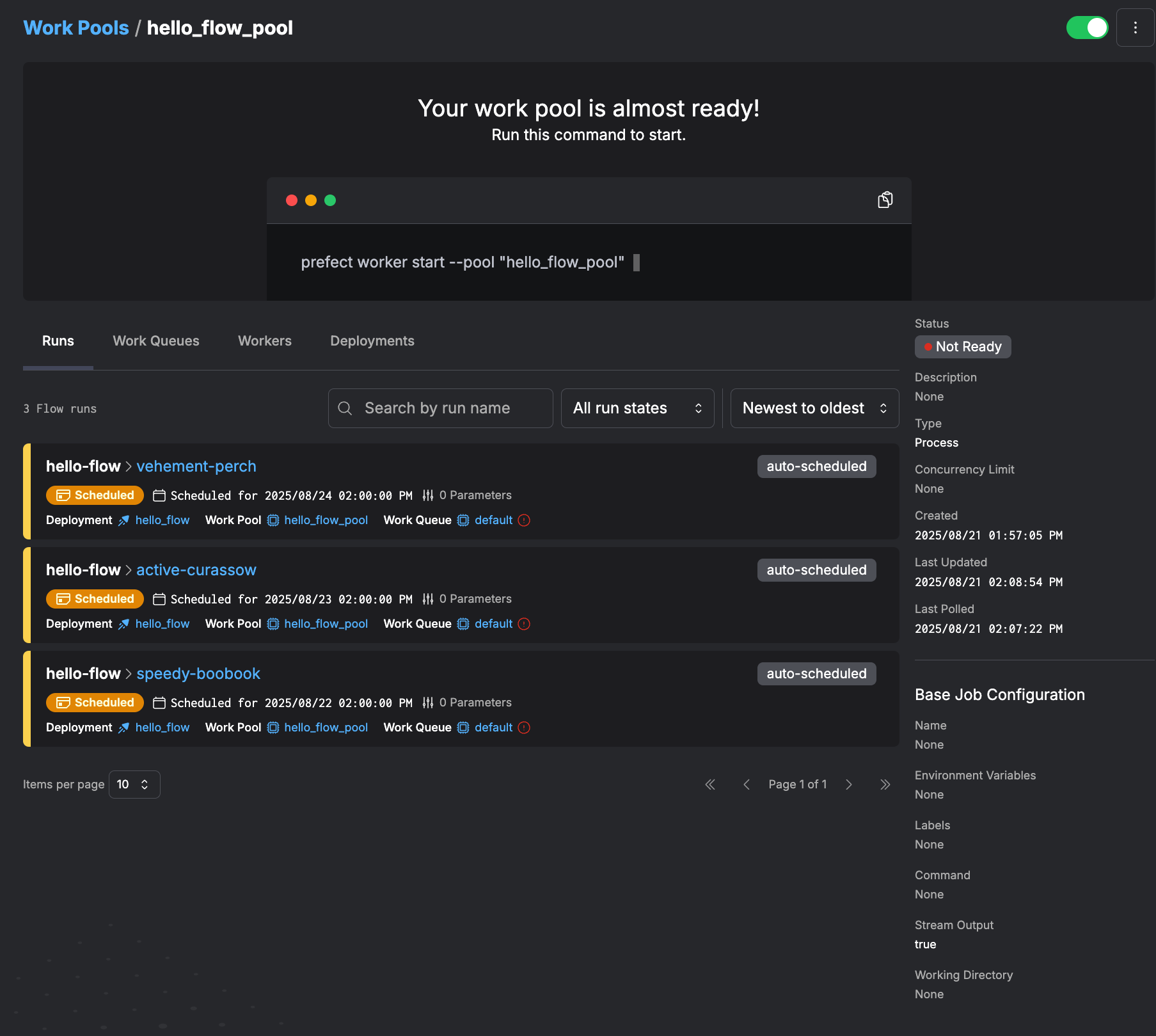 実行環境であるWork Poolを起動するには、Web UI上に表示されている prefect worker start --pool "hello_flow_pool" を実行する必要があります。 このコマンドの実行によってProcessWorkerが起動し、Work Poolsが Ready 状態になります。